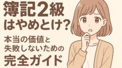 簿記2級「簿記2級はやめとけ?」本当の価値と失敗しないための完全ガイド 「簿記2級なんてやめとけ」「今どき簿記2級は意味がない」「時間の無駄だ」——このような言葉をネットで見かけて、不安や疑問を感じていませんか? 簿記2級の取得を検討している方にとって、このような否定的な意見は心に引っかかるものです。特... 2025.06.14簿記2級